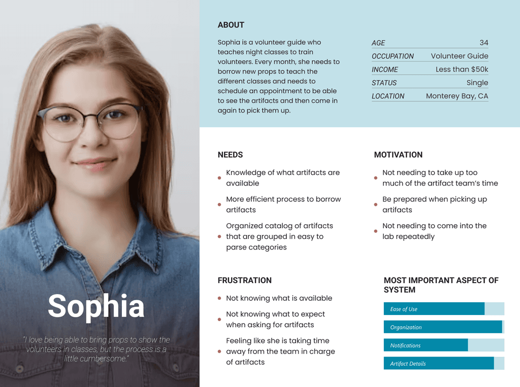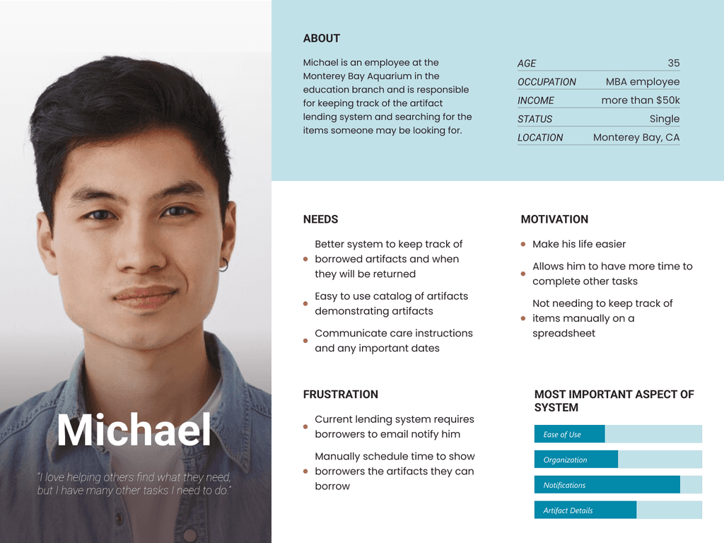Our personas were the two main roles found in the requesting and borrowing process, the Admin ("Michael") and the Requester ("Sophia"), with the primary user being Michael.