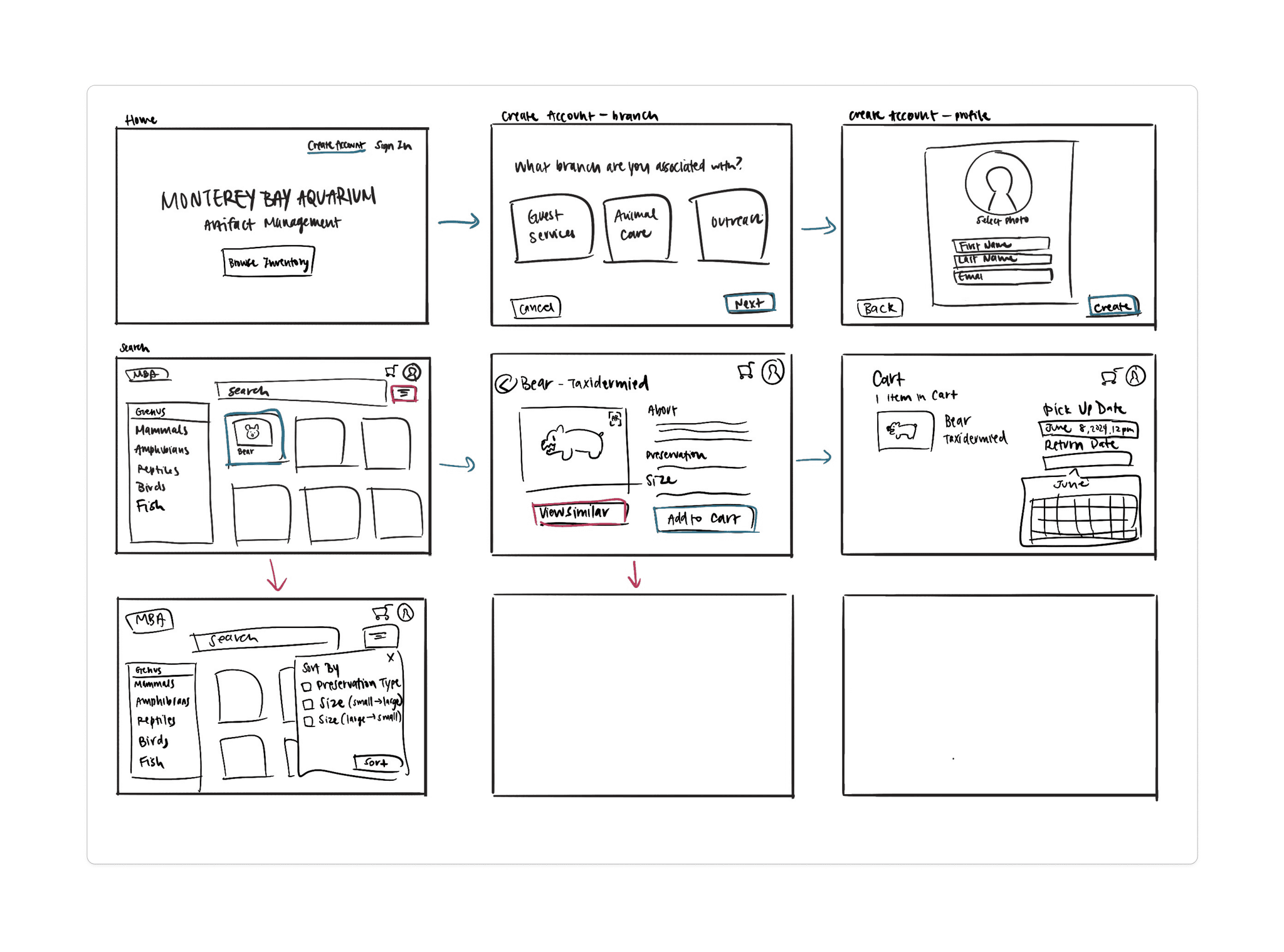 Low-fidelity wireframes were developed after deciding to move forward with an online-checkout-like user flow. Flows for both the Admin and Requester were developed and then tested with actual MBA employees via on-sites.