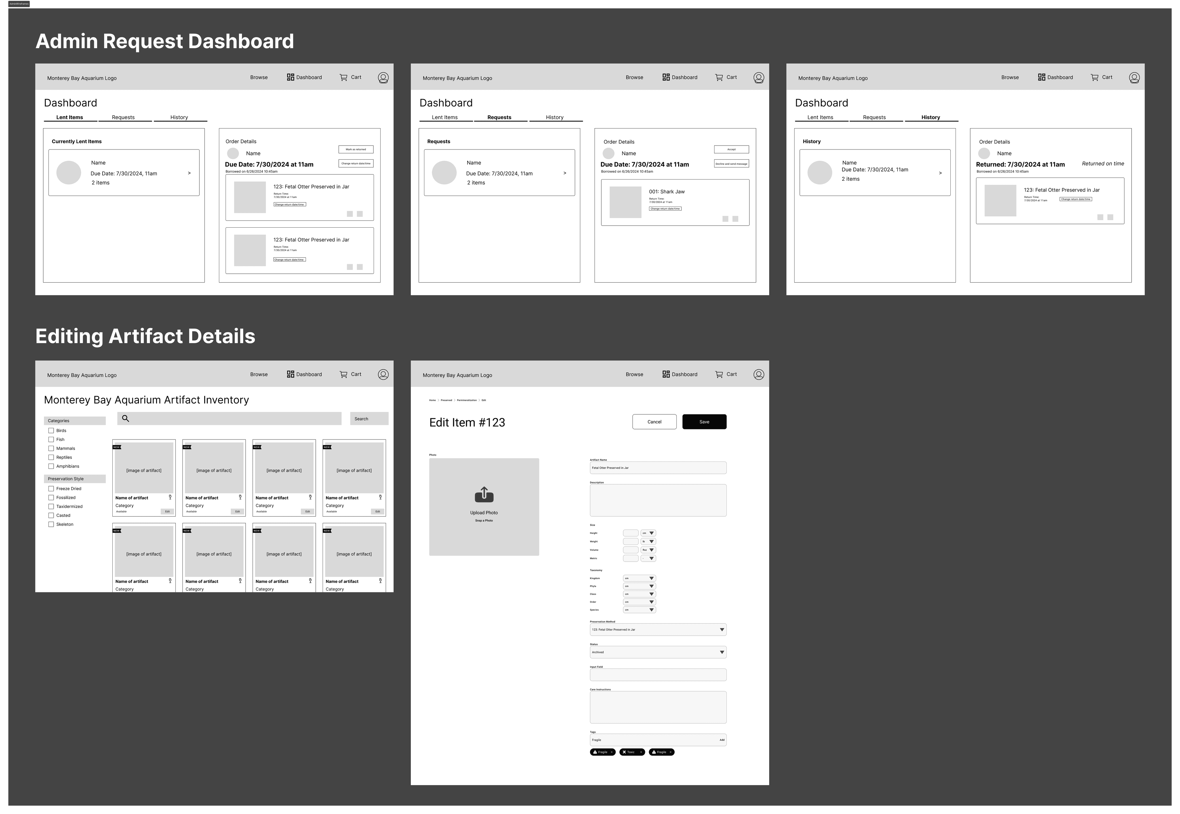 We started with interviews and field observations of educators and admins to understand how requests were currently made and fulfilled. From these insights, we developed user personas for the two key roles (Requesters and Admins), along with journey maps highlighting key breakdowns — like difficulty tracking item status or confirming pickup logistics. We also analyzed online “shopping” patterns as inspiration for how users might browse and filter artifacts.
