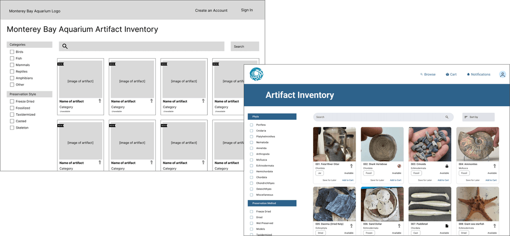 Our low-fidelity designs were tested with our direct users, and we walked away with specific points of improvement. Due to the timeline of this project, the UX adjustments were made at the same time as our transition into a higher fidelity. One insight that stood out was the need to catalog items with biological specificity (like taxonomy), which we never would’ve considered without user feedback.