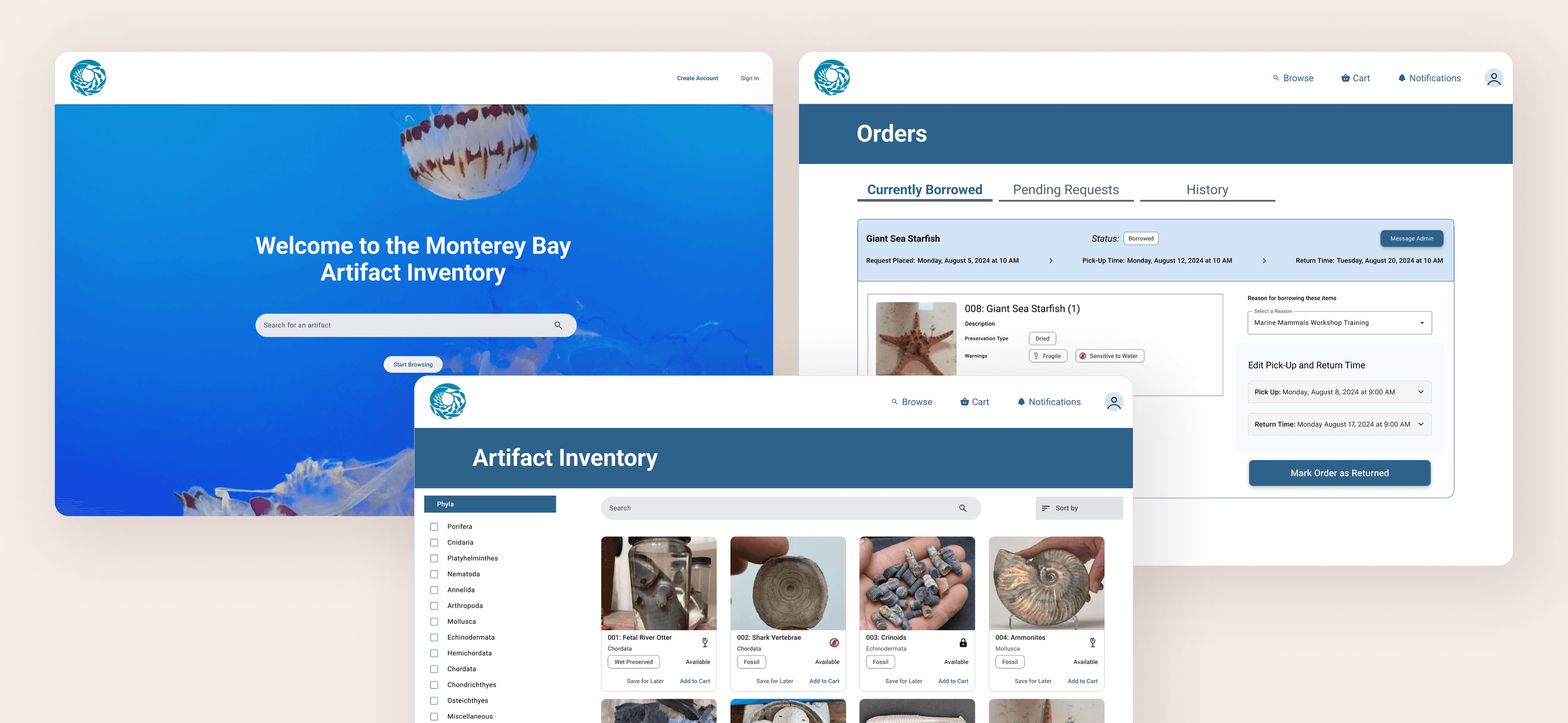 Requesters could submit detailed borrow requests through a multi-step form that mimicked a checkout flow. For example, a staff member prepping for a training could search for a sea otter skull, see that it’s available, and submit a borrow request in just a few clicks—without needing to track down a specific admin or send any emails.
